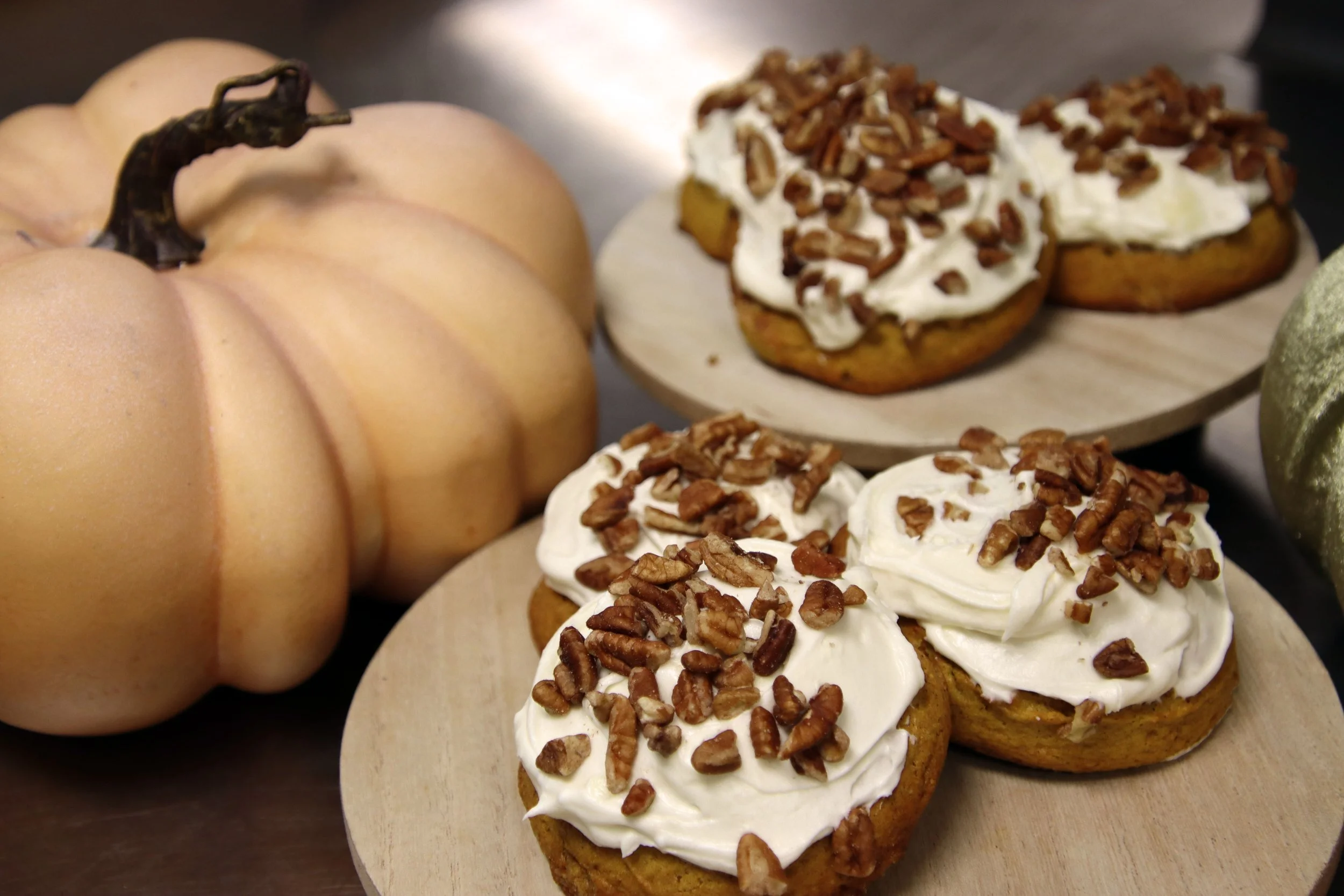 INGREDIENTS: Flour, baking powder, cinnamon, baking soda, nutmeg, ginger, butter sugar, vanilla, eggs, pumpkin puree, cream cheese, pecans